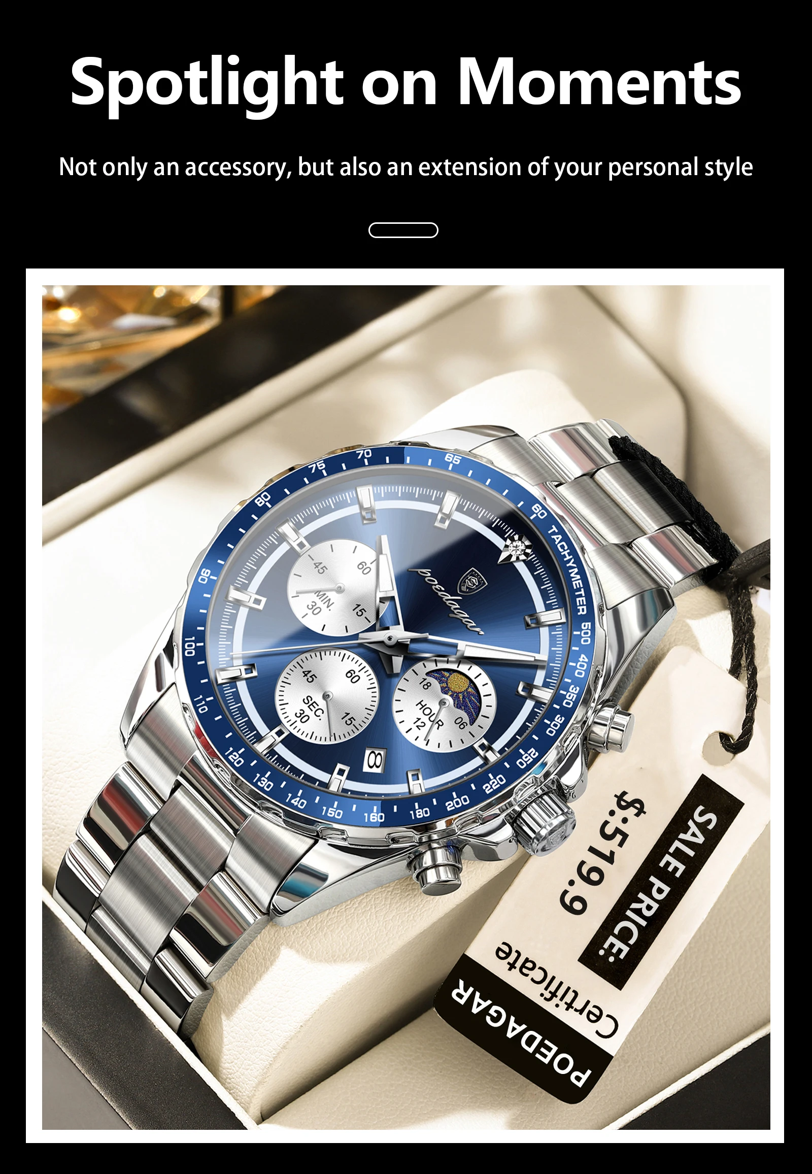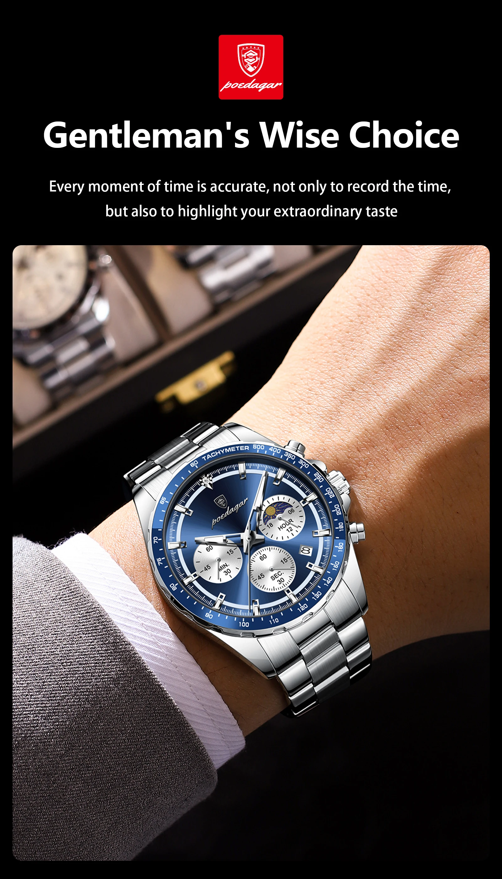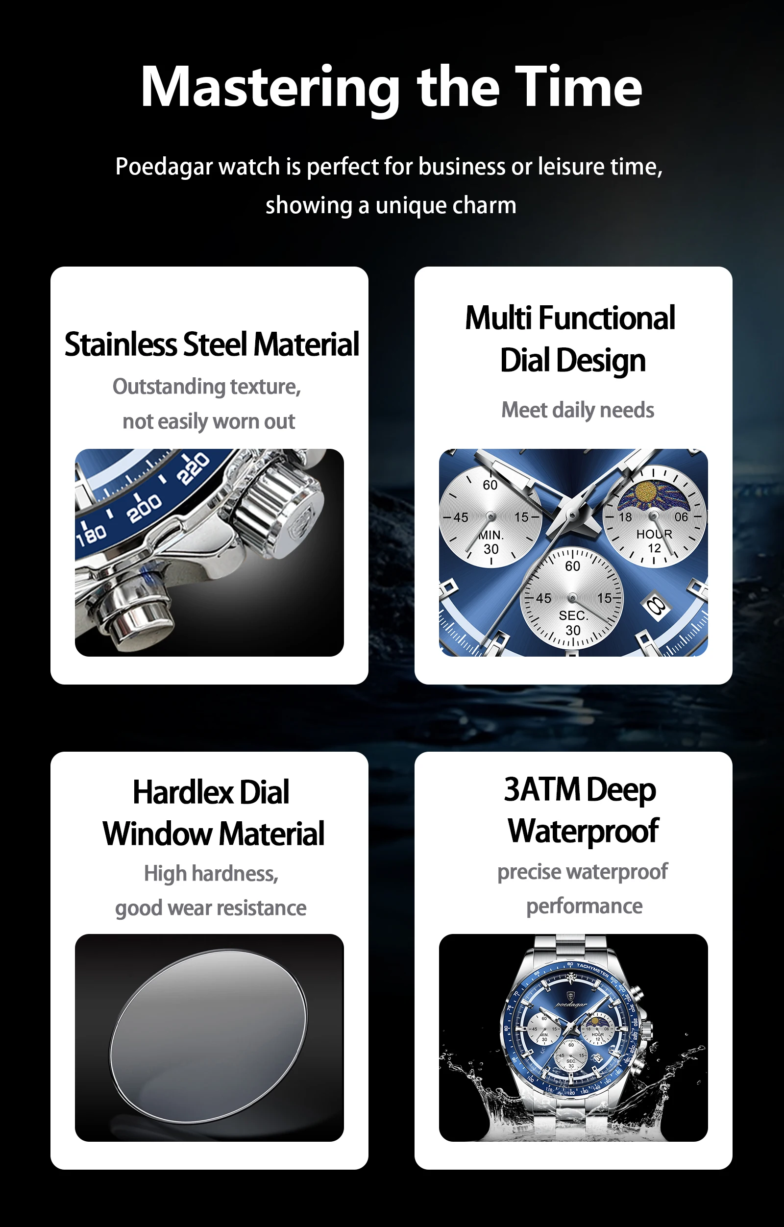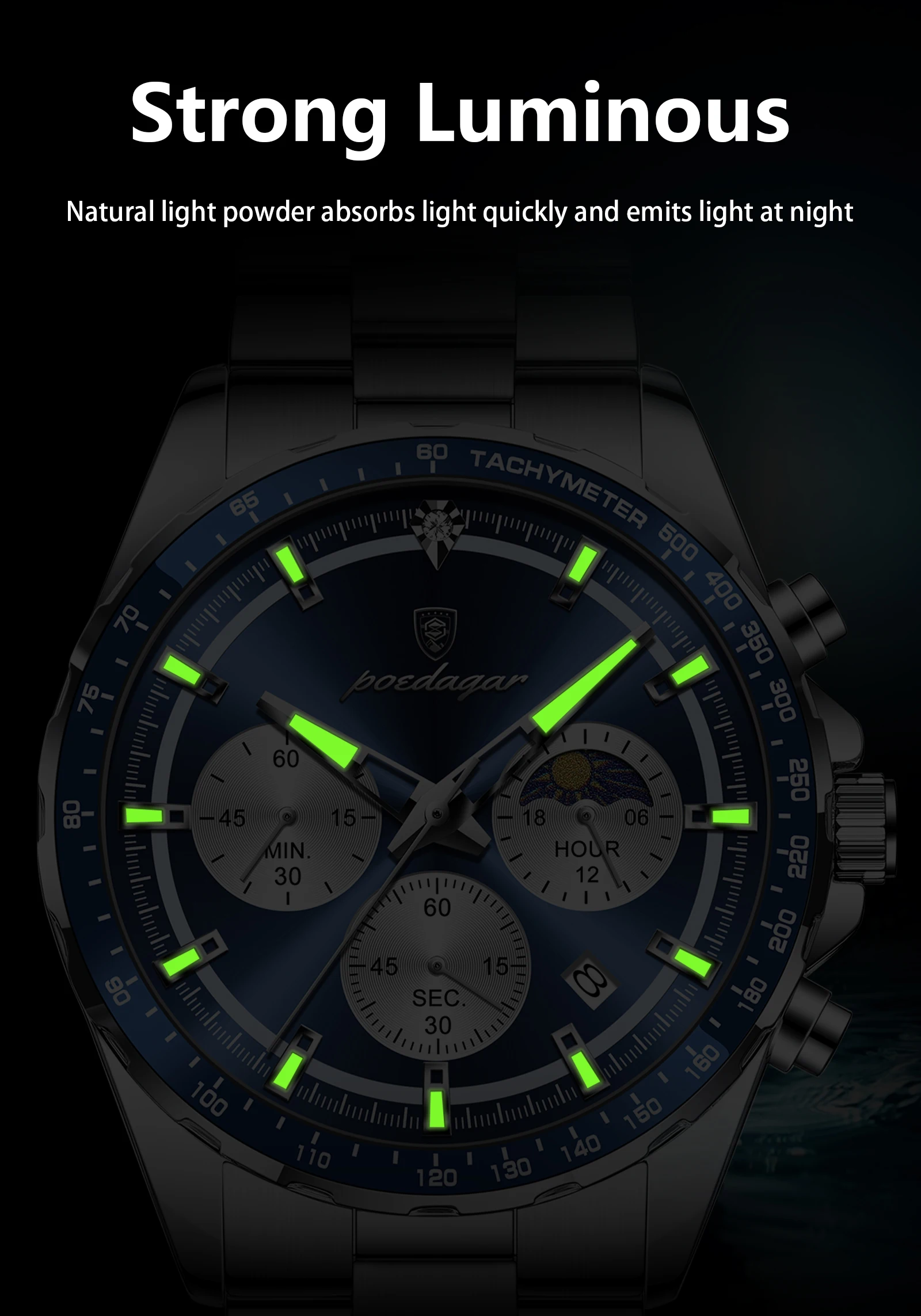 POEDAGAR Luxury Sport Watch For Men Waterproof Luminous Date Chronograph Man Wristwatch Stainless Steel Men's Quartz Watches+Box